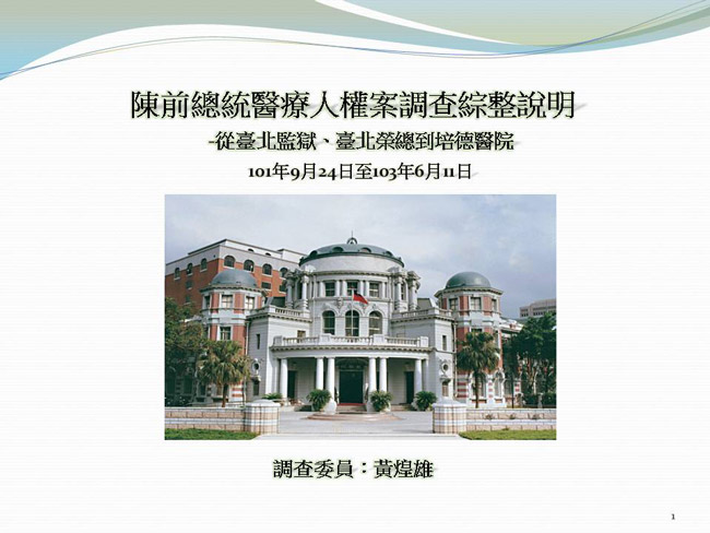 本案通過以後,政府對於陳前總統的處遇分兩歩走:第一步,於102年4月19日,即調查報告通過後約兩個月,陳前總統由台北榮總移監台中監獄,監宿環境有顯著的改善。第二步則於104年1月5日,即於黃煌雄卸任後約五個月,陳前總統在被關了2231天後,以「保外就醫」名義,「居家療養」。隨著陳前總統的「居家療養」,因陳前總統入監服刑以來,長期所引發的朝野抗爭,漸趨平靜。